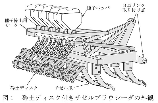 - 砕土ディスク付チゼルプラウシーダは1工程で耕起・播種・砕土を行う。チゼル爪で耕起された土塊はチゼル爪の後方に配置されたディスク(花型ディスク、外径450mm、取り付け間隔18cm、12枚)で小さな土塊に砕土され、砕土ディスクの上方に位置する種子導管より排出された種子が、砕かれた小土塊と混和され、覆土される(図1)。