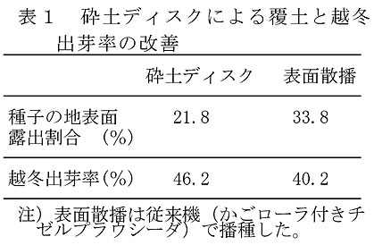 そこで、表面散播方式で種子を覆土する機構を備えた播種機を開発し、越冬性を改善する方策を検討する。
