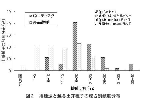 - 従来のかごローラ付チゼルプラウシーダによる表面散播では、越冬出芽種子は地表から深さ2p程度までの浅い層に多く分布するのに対して、砕土ディスク付チゼルプラウシーダでは1.5〜3pの層に多く分布する(図2)。砕土ディスク付チゼルプラウシーダは従来の表面散播式に比べて播種直後の種子の地表面露出割合が低く、越冬出芽率が約6ポイント向上する(表1)。