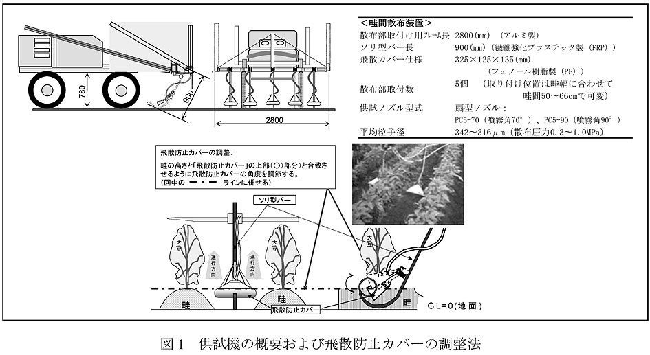 - 畦間散布装置は懸垂型のソリ型バーに畦間散布用の扇形ノズルと飛散防止カバーで構成される。乗用管理機の散布バー部にゴム製の波ベルトで固定する簡易な構造であることから多様な畦幅に対し調節可能である(図1)。