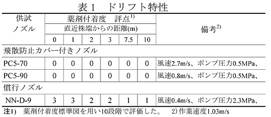 - 噴霧角90°の散布ノズル(PC5-90)では、作物体下部への付着が見られるが、噴霧角70°の散布ノズル(PC5-70)では、作物体への付着は認められない。また、噴霧角70°の散布ノズルは、風速2.7m/sの条件下においても機体端より風下10mまでの感水紙に付着はなく、ドリフトは生じない(表1)。