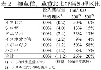 - 本装置により大豆作で除草剤散布した結果、表2に示すような除草効果が認められる。一部に下位葉への付着による薬斑がみられるが、大きな薬害は認められない。