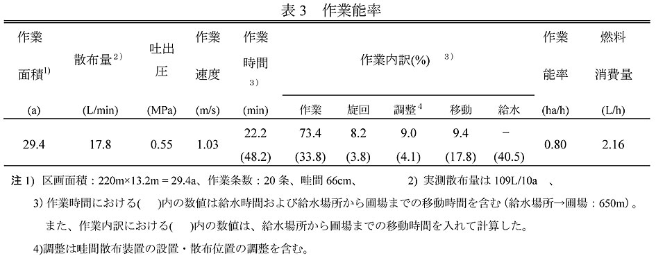 - 本装置を装着した乗用管理機(BSA 530)での作業能率は、0.80ha/h(面積29.4a(220m×13.2m)の圃場において、平均作業速度1.03m/s)であり、燃料消費量は2.16L/hである(表3)。