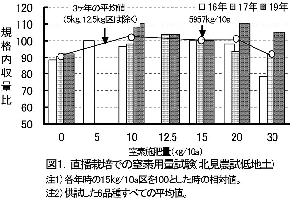 - 窒素施肥量は10〜12s/10aでも充分である(図1)。直播栽培における施肥量は移植栽培に準じ、土壌診断に基づく施肥対応を行う。