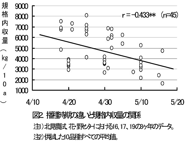 - 北海道における春まき直播栽培では、播種が遅くなるにつれて収量も急激に低下することから、播種は圃場が適正な土壌水分になった時点でできるだけ早く行い、4月中には終わらせることが望ましい(図2)。