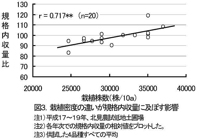 - 株間を狭くすることで栽植密度を高めた場合、平均球重は低下するものの収量は増加する。