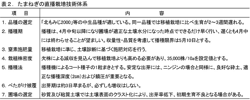 - 以上の結果を総括し、北海道におけるたまねぎ直播栽培の栽培技術体系を提案する(表2)。
