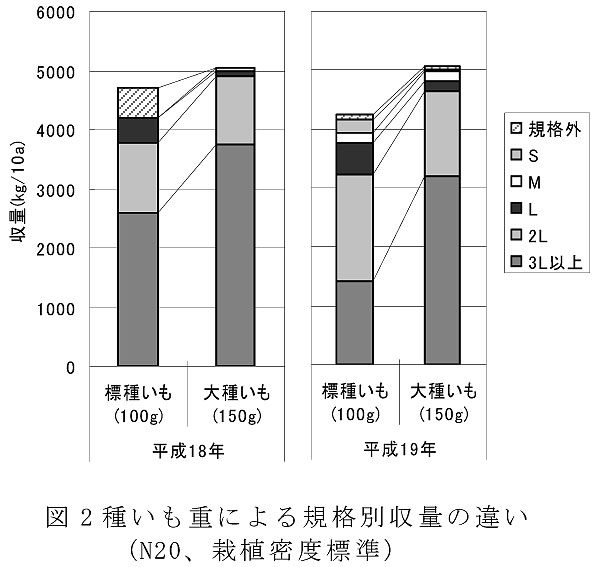 - 施肥窒素20kg/10aの条件で、種いもを標準の100gから150gへと大きくすることにより、いも径及び重さが共に増大し、3L規格以上の収量が高まる(図2)。