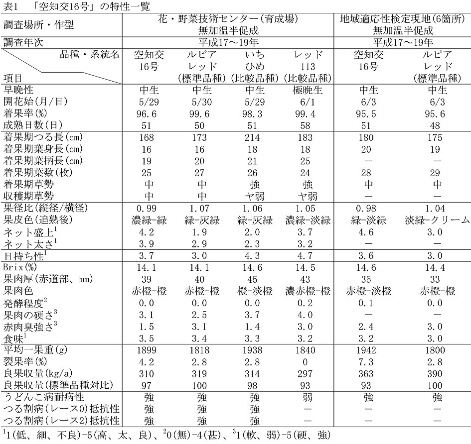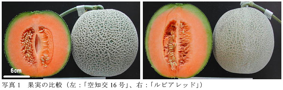 「空知交16号」はネットの盛上りが「ルピアレッド」より良く、アールス系メロンに近い外観品質を有する。草姿はコンパクトであり栽培管理が行いやすい。うどんこ病に耐病性を有する。
