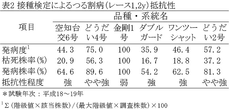 - えそ斑点病に対して標準台木品種と同様に質的(真性)抵抗性を有する(表1)。レース1,2yに対する抵抗性は「どうだい4号」より強く、比較台木品種と同等であり、甚発生圃場を除き一般の発生圃場では十分な実用性を有する(表2)。つる割病(レース0、レース2)に対して質的(真性)抵抗性を有する(表3)。