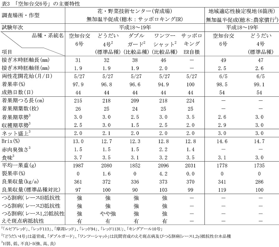 - ネット形質は標準・比較台木品種及び自根と同等である。糖度(Brix)は標準台木品種、「ワンツーシャット」及び自根と同等、「ダブルガード」よりやや優る(表3)。