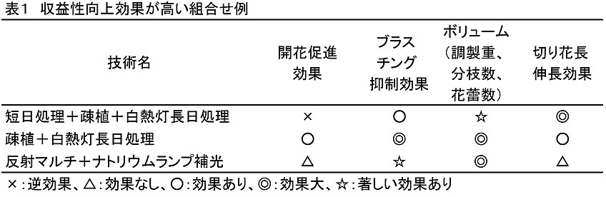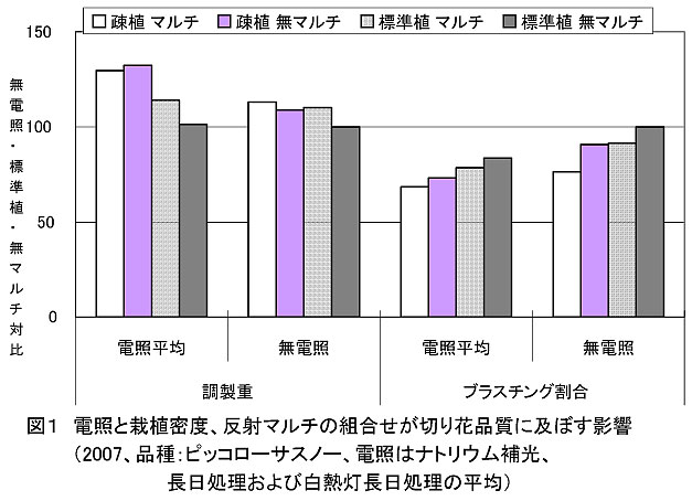 - 疎植および反射マルチの設置による光環境改善においても切り花のボリューム増加と ブラスチング抑制効果が認められ、これらと電照法を組合せるとより品質向上効果が高まる(図1)。
