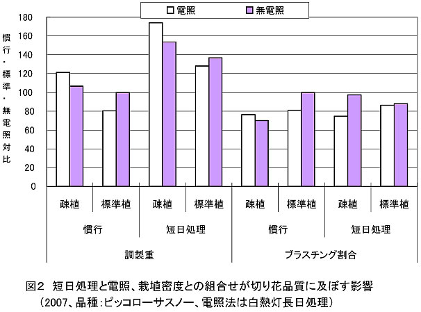 - 栄養生長促進技術である定植後1ヶ月間の短日処理により切り花のボリュームは大幅に増加するがブラスチング抑制効果は認められない。しかし、光環境改善技術との組合せにより一層のボリューム増加とブラスチング抑制が可能となる(図2)。
