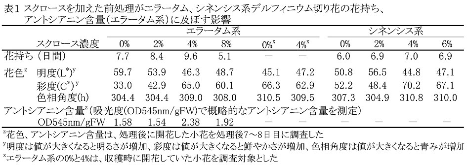 デルフィニウムの前処理にスクロース処理を組合せることで、花持ちの延長、花色の発色不良抑制に効果がある。ばらにおける湿式トラック輸送では乾式航空機輸送より鮮度及び花持ちが優れ、高温輸送時のスクロース処理による切り花品質改善効果が大きい。