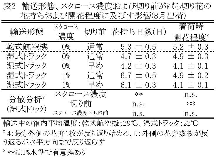 - ばらにおいて、輸送温度の高い 8月出荷では10月出荷に対して、湿式トラック輸送時のスクロース処理による花持ち延長効果が大きく、切り前を早めることにより咲き進みを抑制することが可能である(表2、3)。