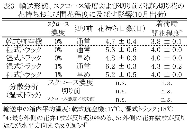 - スクロース処理を行うばらの湿式トラック輸送は、乾式航空機輸送より花持ちが延長する(表2、3)。