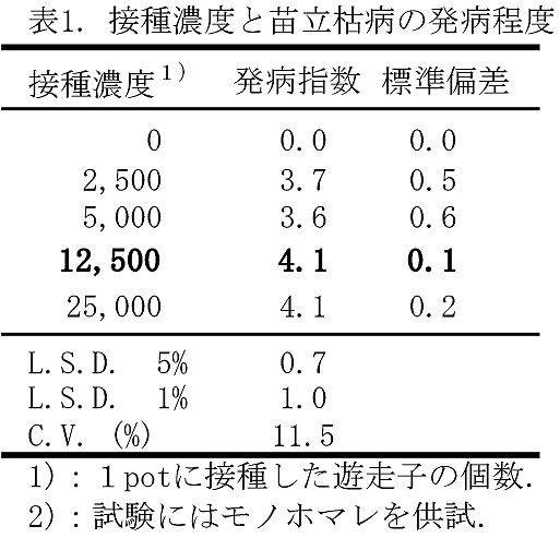 - 接種濃度を1ポット当たり遊走子12,500個(以下12,500/pot)以上とした場合、発病指数がそれ以下の接種濃度の場合に比べて高い。また、反復間差についても小さく、安定した発病がみられる(表1)。