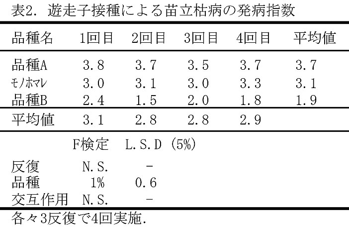 - 接種濃度を12,500/potとした場合、苗立枯病の発病指数には明瞭な系統間差が認められる。「品種A」、「モノホマレ」および「品種B」の発病指数は、反復毎の変動は小さく、品種間差の変動もみられないことから、本手法により品種の苗立枯病抵抗性を簡便に検定できる(表2)。