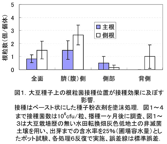 - 種子接種の場合に接種効果がより顕著に出る主根根粒の着生数が、根粒菌の接種位置を臍(腹)側から、側部、背側へと発根部から徐々に遠ざけるに従って低下し、種子表面に接種された根粒菌が根に侵入する土壌域まで土壌中を十分に移動できない(図1)。
