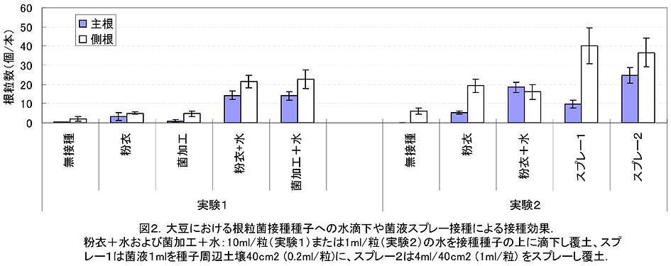 - 菌液、根粒、根粒菌、接種、種子粉衣、ダイズ