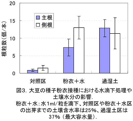 - 栽培土壌の土壌水分を高めると種子粉衣でも接種効果が向上して、水滴下処理による種子根が伸長する土壌域への根粒菌局所接種と匹敵するようになり、接種菌の移動性は栽培土壌の水分条件によって影響されている(図3)。