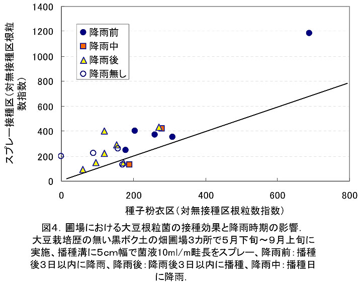 - 種子周辺土壌への菌液スプレー散布でも接種効果を高めることが可能であり(図2、実験2)、圃場試験でも、播種日前後の降雨条件を問わず菌液スプレー接種は種子粉衣よりも接種効果が高い(図4)。