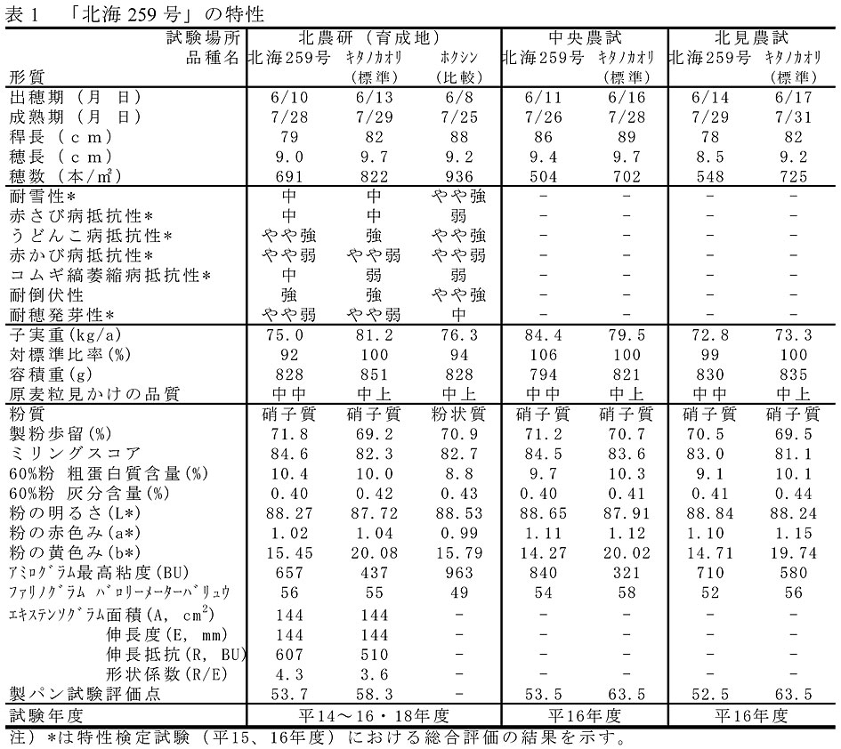 - 「北海259号」の特性(「キタノカオリ」との比較、特性の十分な理解のため北海道の基準品種「ホクシン」の特性についても記載;表1)