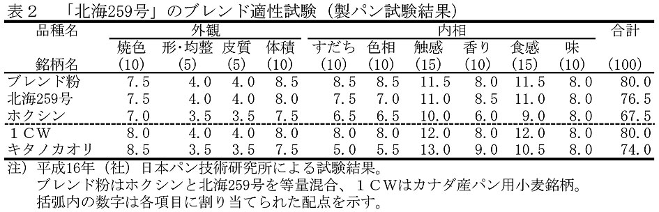 「北海259号」は耐倒伏性に優れる超強力秋まき小麦である。「ホクシン」等の中力小麦とブレンドすることにより、優れた製パン適性を示す。