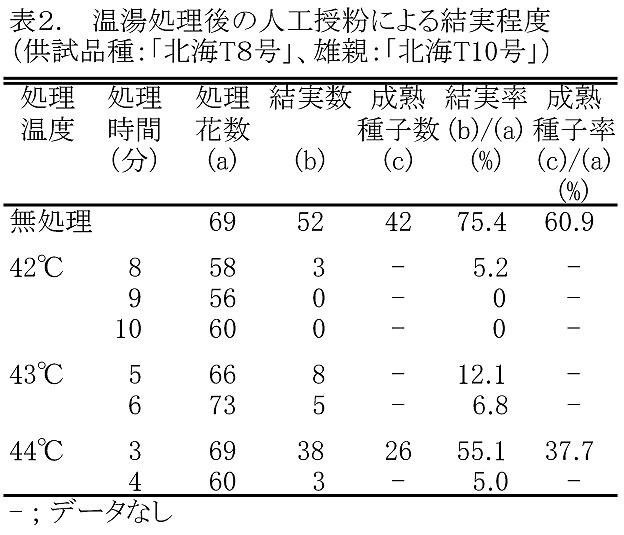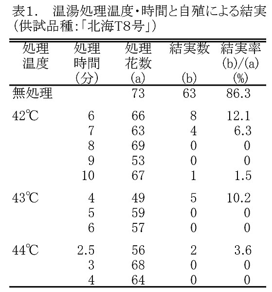 - 44℃・3分間の温湯処理は、様々な品種・系統への適用性も高く、ほぼ確実な除雄と人工授粉による結実が得られる(表3)。