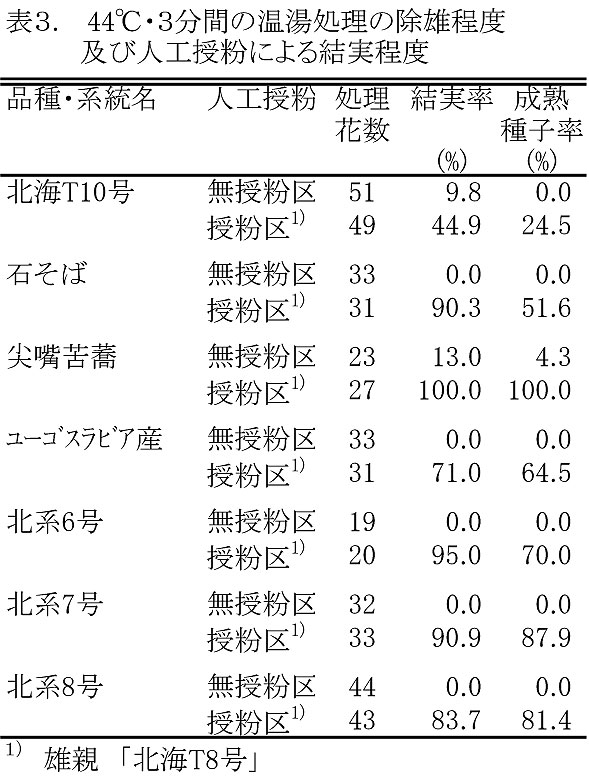 ダッタンソバは、交配の前日午後に最頂花房の蕾を44℃、3分間の温湯処理で除雄し、翌朝に開花した花に人工授粉を行うことにより、高率に雑種種子が得られる。