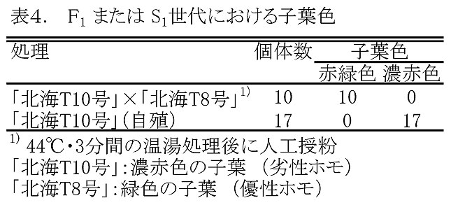 - 以上の温湯処理と人工授粉により雑種が得られ(表4)、交雑育種が可能となる。