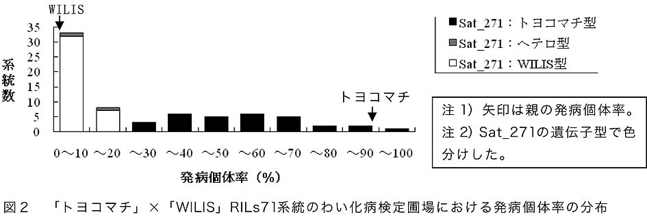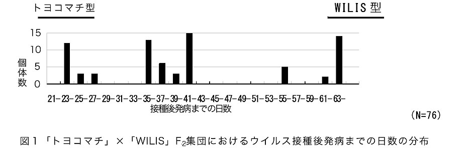 - ウイルス接種検定において、「WILIS」は「トヨコマチ」より病徴の発現が明らかに遅く、そのF2集団では発病の遅延程度を示す「接種後発病までの日数」がWILIS型・トヨコマチ型・中間型に不連続分布を示すため、抵抗性検定の指標とできる(図1)。