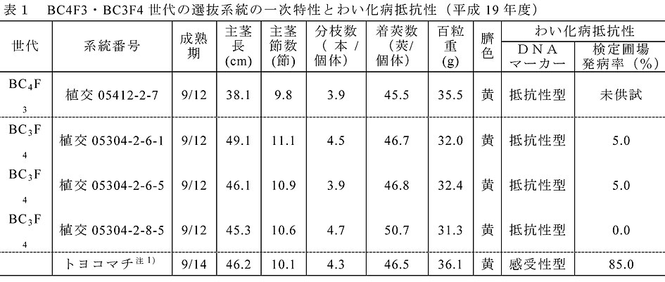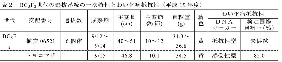 - BC5F2世代選抜個体は、マーカーによりわい化病高度抵抗性の固定が確認され、一次特性が概ね「トヨコマチ」並である。戻し交配を重ねたことにより、BC3F4世代と比較して百粒重がより「トヨコマチ」並に近付いている(表2)。
