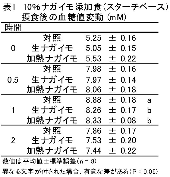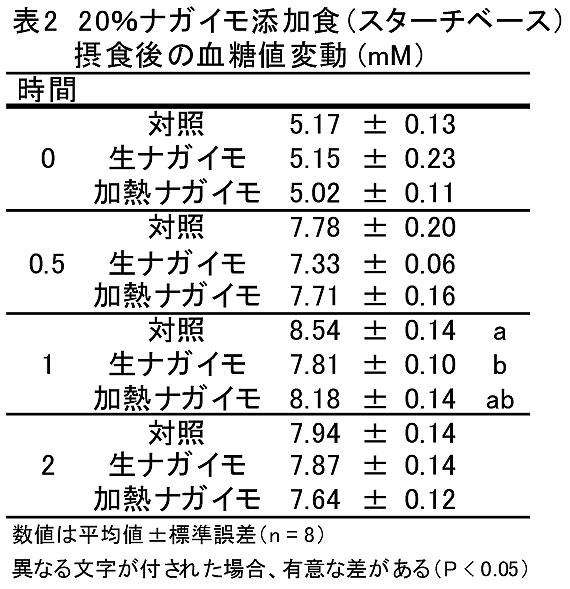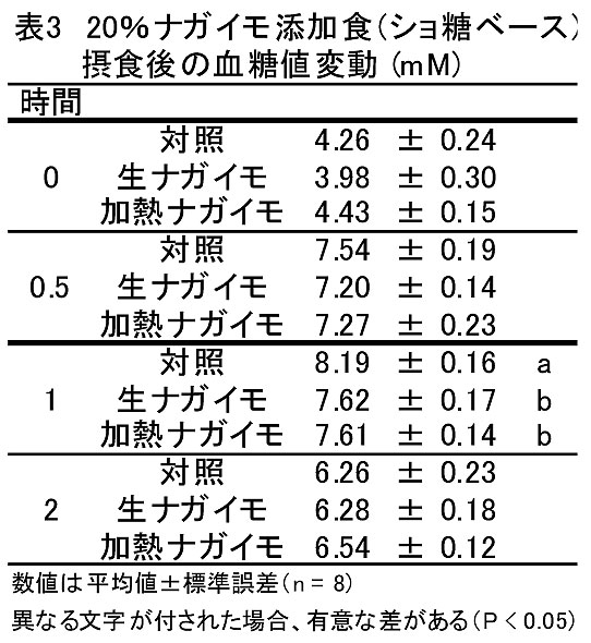 - ショ糖ベースの対照食(ショ糖含量は45%)に対し、生または加熱したナガイモの凍結乾燥粉末を食餌全体に対して20%となるように添加した食餌をラットに与えたところ、摂食開始後1時間目の血糖値は、対照と比較して両ナガイモ粉末添加食群で有意に低下する(表3)。