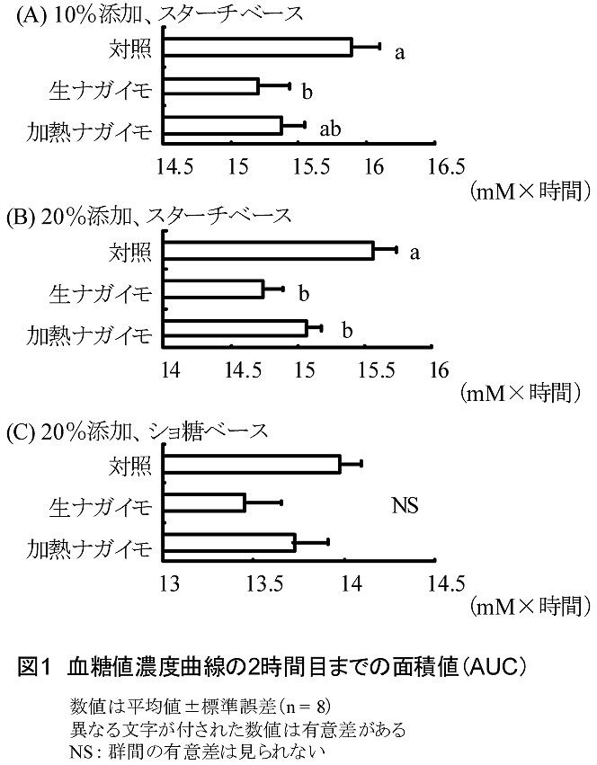 - コーンスターチベース(コーンスターチ含量は53%)の対照食に対し、生または加熱したナガイモの凍結乾燥粉末を食餌全体に対して10%となるように添加した食餌をラットに与えたところ、摂食開始後1時間目の血糖値は、対照と比較して両ナガイモ粉末添加食群で有意に低下する(表1)。また、血糖値上昇の指標である開始後から2時間目までの血糖値の濃度曲線面積値(AUC)において、10%生ナガイモ粉末添加食群で、対照と比較して有意に低くなる(図1(A))。