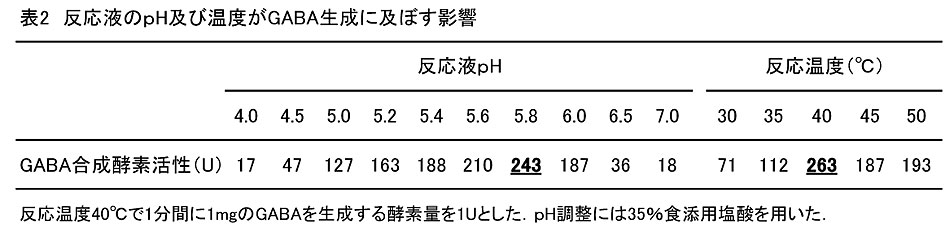- 小麦胚芽中のGABA合成酵素活性は反応液pH5.8で最も高く、反応温度40℃で最も高い(表2)。