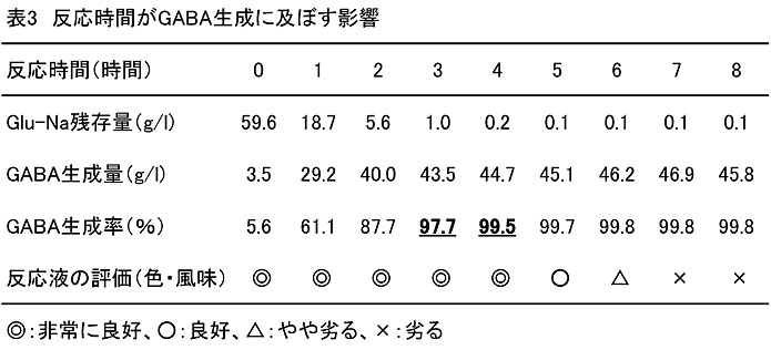 - GABAの生成率は反応3〜4時間でほぼ100%となり約45 g/lのGABAが得られる。その後、生成率はほぼ100%を維持するが反応7時間以上では反応液の酸化、雑菌の増殖等による反応液の色、風味の劣化が起こる(表3)。