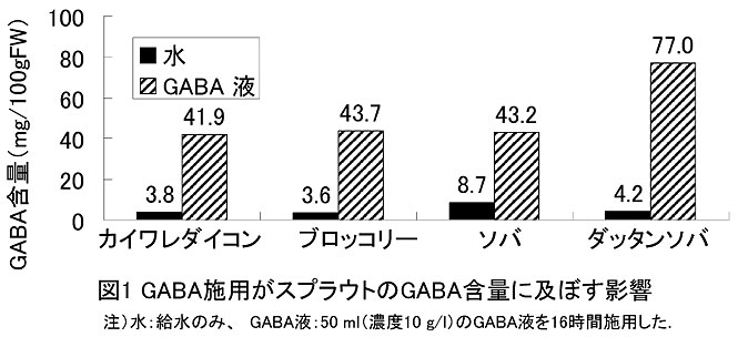 - 水耕栽培のカイワレダイコン、ブロッコリー、ソバおよびダッタンソバのスプラウトは給水のみの場合でも1〜10 mg/100gFWのGABAを含有するが、10 g/lの濃度に調整したGABA液を50 ml、16時間水耕施用することで約40〜80 mg/100gFWに増加する(図1)。