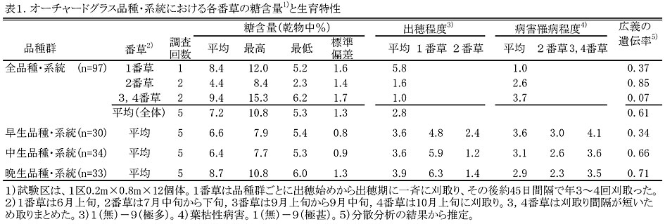 オーチャードグラスの糖含量は、品種・系統間、番草間で大きな変異がある。2番草糖含量は広義の遺伝率が高く、年次間変動が小さく、各番草と有意な相関がある。高糖含量オーチャードグラスは、2番草で糖含量と病害罹病程度を評価し選抜することにより育成できる。