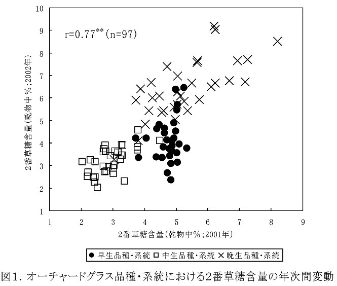 - 2番草糖含量は、1番草との間にr=0.74(n=31)および3、4番草との間にr=0.46(n=97)の有意な相関がある。2番草糖含量の年次間の相関係数はr=0.77で、1番草(r=0.39)および3、4番草(r=-0.03)の年次間相関係数より高い(図1)。2番草糖含量は、年次による品種・系統間の序列の変動が小さく安定した評価が可能である。