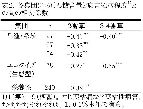 - 各集団において、2番草および3、4番草糖含量と病害罹病程度との間には有意な相関があり、葉枯性病害に罹病することにより、糖含量が低下する傾向がある(表2)。