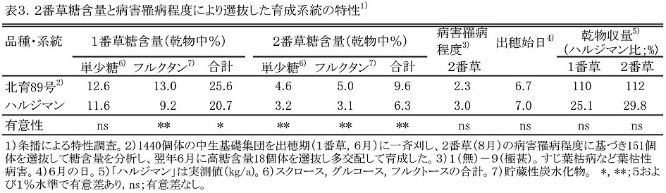 - 多数の個体から病害罹病程度の低い個体を選抜し、その中から2番草糖含量の高い個体を選抜して育成した「北育89号」の1および2番草糖含量は、中生の標準品種「ハルジマン」に比べて有意に高く、貯蔵性炭水化物であるフルクタンの含量が高い(表3)。