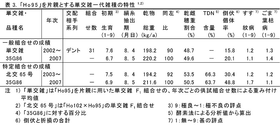 サイレージ用トウモロコシの親自殖系統「Ho95」(エイチオーキュウジュウゴ)は、晩生のフリント種で、初期生育、すす紋病抵抗性、ごま葉枯病抵抗性および耐倒伏性に優れ、デント種との組合せ能力が高く、一代雑種品種の親系統として利用できる。