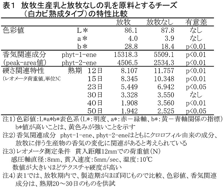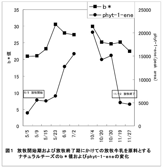 - 放牧生産乳を原料としたチーズは、放牧の特徴を示すと考えられる色(b*値)と、放牧生産乳のチーズの香気に関連すると考えられる成分であるphyt-1-eneの数値が、5月初旬の放牧開始から10日後頃から上昇する。また、秋期は放牧終了直前の10月末頃から低下する。(図1)。