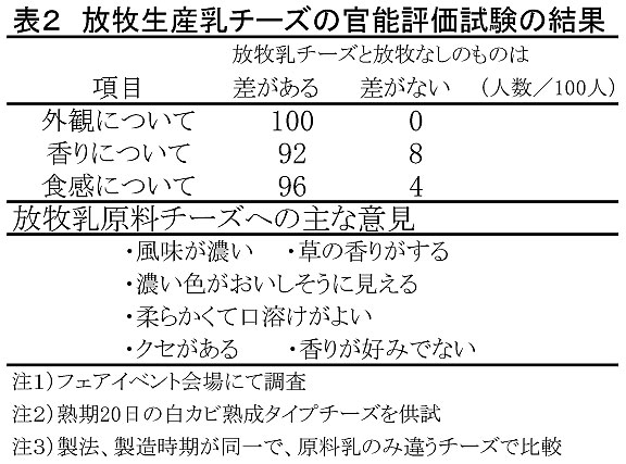 - 官能評価試験では、外観、香り、食感の各項目について、放牧生産乳を原料とするチーズと放牧なしで生産された乳を原料とするチーズの差違が90%を超える高い割合で認識され、両者の差別化は可能である。(表2)。