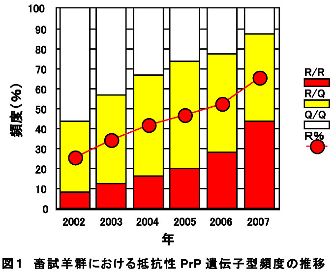 - 畜試のサフォーク羊群におけるPrP遺伝子型では、感受性に関わるコドン136はすべて非感受性のアラニン(A)ホモ(A/A)であり、感受性のバリン(V)は検出されていない。抵抗性に関わるコドン171には抵抗性のアルギニン(R)と非抵抗性のグルタミン(Q)が検出され、抵抗性ホモ(R/R)、抵抗性ヘテロ(R/Q)、非抵抗性ホモ(Q/Q)の3タイプが存在する。R/R雄羊の交配割合を高め、抵抗性Rの遺伝子頻度を高める育成羊の選抜により、羊群の抵抗性Rの遺伝子頻度は2002年の26%から2007年の66%に上昇している(図1)。