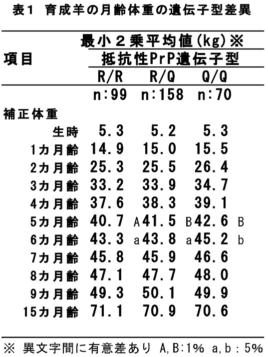 - 損耗率、雌羊の繁殖成績、子羊の発育成績、および雄子羊の肥育成績について実施した生産性の評価では、ほとんどの項目でPrP遺伝子型による有意差が認められない。発育成績では5、6カ月齢体重(表1)と体尺値の一部に有意差があるが、月齢の進行により解消している。肥育成績では乾草摂取量に有意差があるが、飼料要求率や生産された枝肉の量・質に影響はない。したがって、PrP遺伝子型のスクレイピー抵抗性Rを優先する選抜は生産性に影響を及ぼさない。