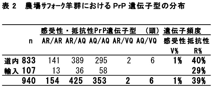 - 道内農場のサフォーク群調査では、抵抗性Rの遺伝子頻度は40%で、感受性のVの遺伝子頻度も1%あり、輸入群では、抵抗性Rの遺伝子頻度は29%とやや低い(表2)。PrP遺伝子型検査を実施した農場では、種雄羊を抵抗性ヘテロから抵抗性ホモに入れ替えることにより、生産子羊の抵抗性Rの遺伝子頻度を大きく向上させている。