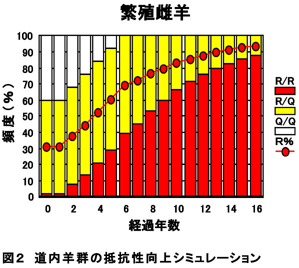 - 抵抗性Rの遺伝子頻度が30%の繁殖雌羊群をモデルにすると、抵抗性ホモの種雄羊による交配を継続することにより、PrP遺伝子型の全頭検査をしなくても羊群のR遺伝子頻度を9年で80%程度まで高めることができる(図2)。