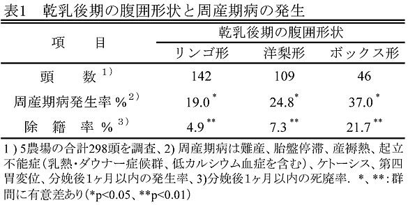 - 腹囲形状は、周産期病の発生を予測する簡易な指標として生産現場で活用できる。